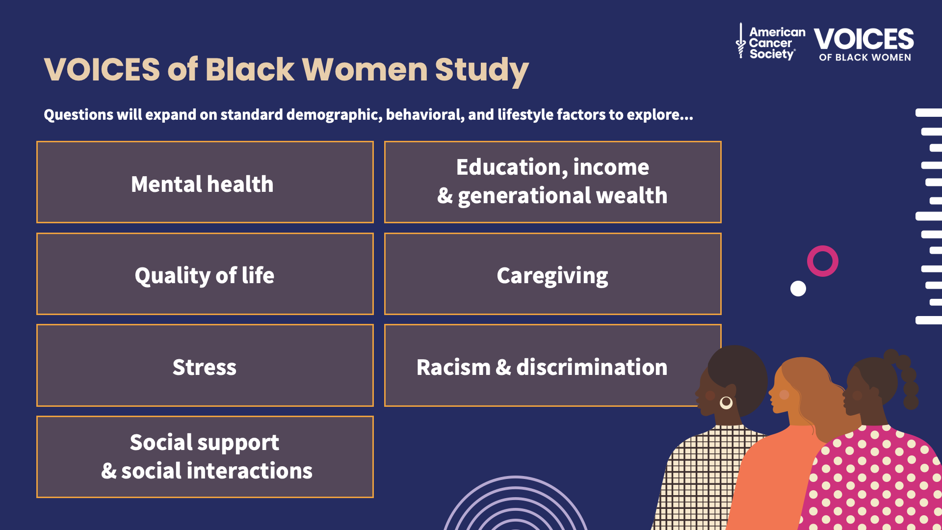 VOICES of Black Women is a groundbreaking long-term study, led by the American Cancer Society and powered by the voices of Black women across the United States. The goal is life-changing: to better understand health conditions like cancer and learn how to improve the overall health of Black women.